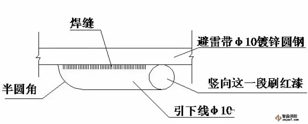 ⑵引下线在女儿墙与避雷带之间这一段要刷红色的油漆做明显的标记,在防雷检查验收时,避雷引下线处很显眼,一看就明白此处为引下点,见下图。
