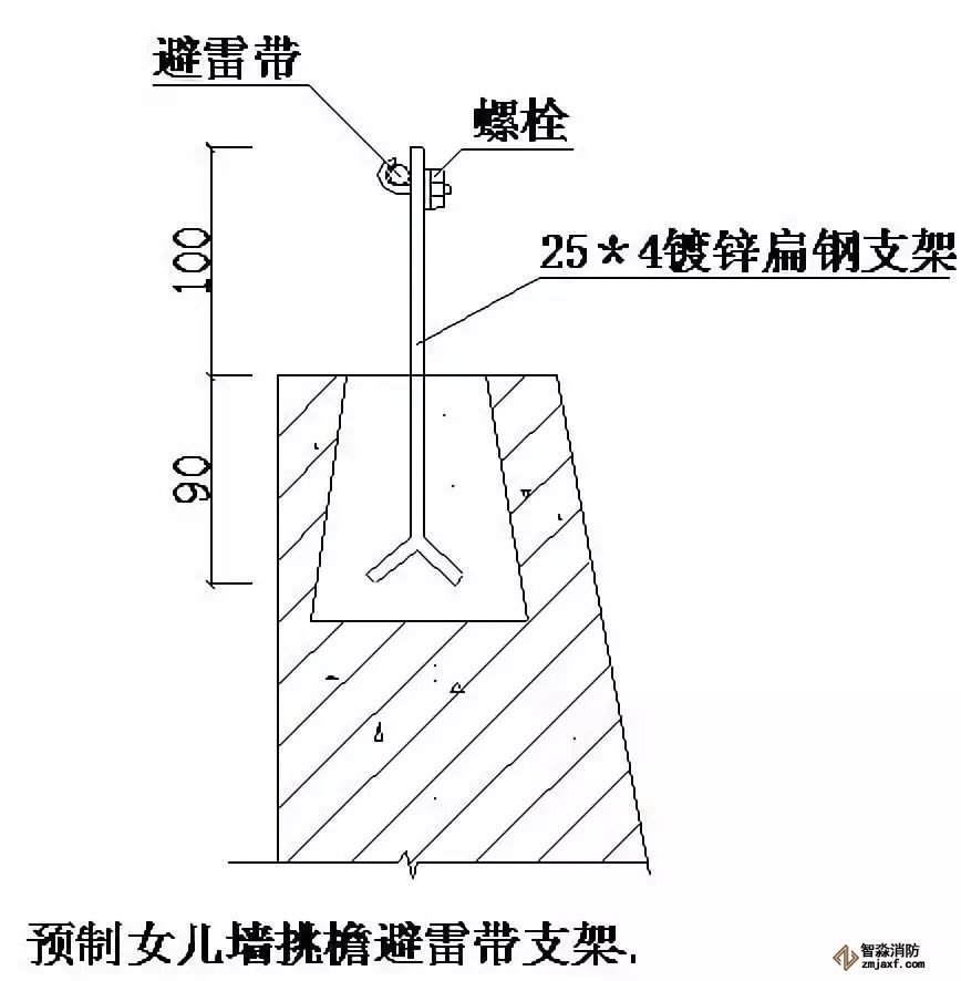 ⑴现浇女儿墙挑檐避雷带支架安装做法如下图,扁钢支架在安装时要密切和土建专业配合好,对成排的避雷带支架的水平度、垂直度要拉线逐个检查。