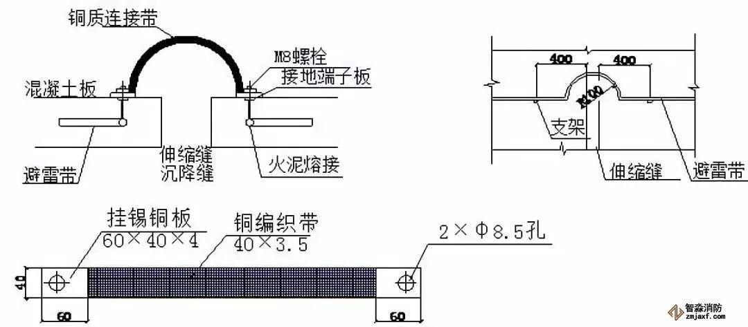 ⑶避雷带、接地母线在过沉降缝、伸缩缝根据以下图示做成半圆形,既保证美观又符合防雷接地要求。