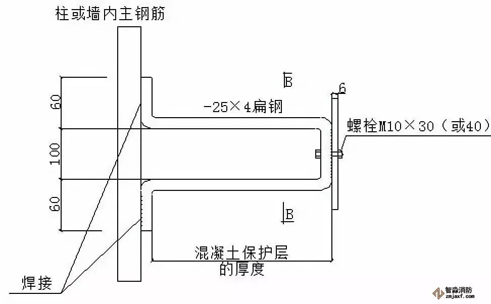 ⑶φ10的金属圆钢与钢筋或窗框等建筑物金属构件焊接长度不小于60mm。
