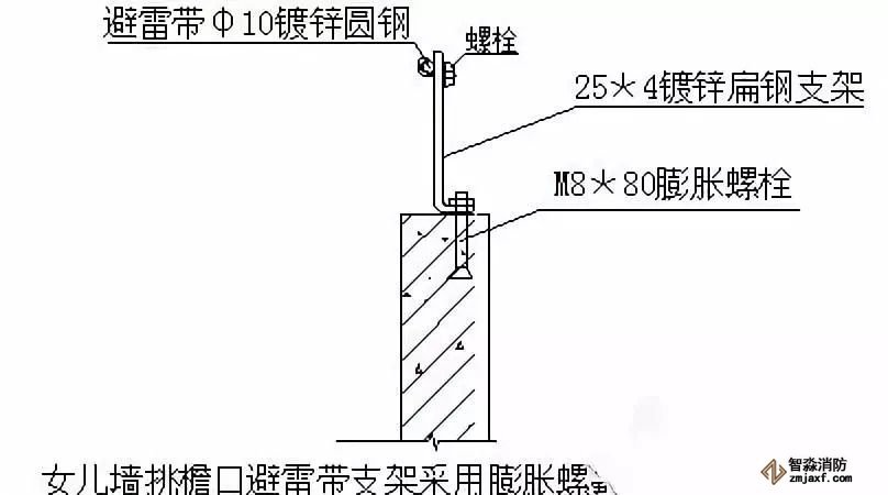 ⑶ 女儿墙挑檐避雷带支架用膨胀螺栓固定安装做法如下图: