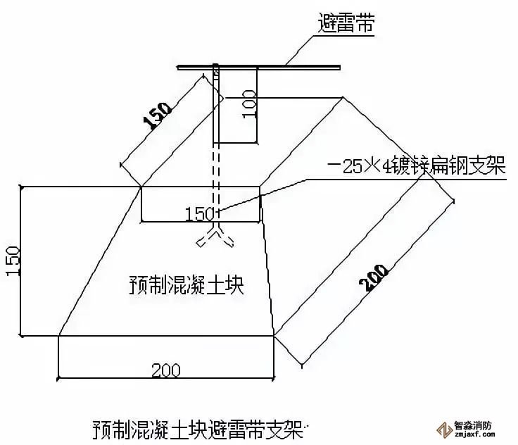 ⑸ 屋顶避雷带支架在预制混凝土块上安装做法: