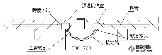 变形缝处理:具体做法如下图所示。金属软管管径与所穿导线截面及数量应适应,接地线选择BVR-4mm2黄绿双色线。