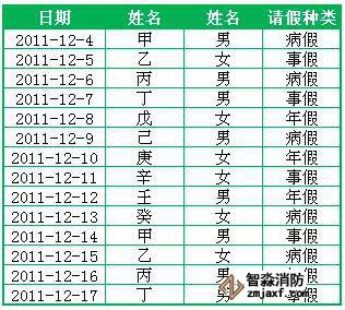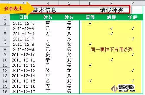 事假、年假、病假同属于请假类别,具有相同属性,应该被记录在同一列。