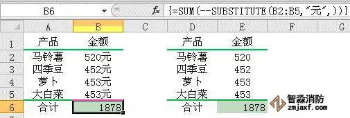 左边含“元”的单元格求和,两个公式均为数组公式: