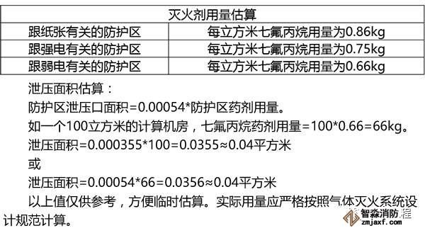 存放图书、档案等跟纸张、磁带、光盘等有关的防护区,以100立方米的防护区,海拔系数为0,钢瓶剩余量为3公斤计算,则100立方米需要85公斤的药剂。折算后,每立方米需要0.85公斤七氟丙烷
