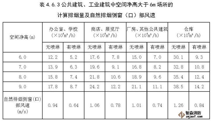 2 公共建筑、工业建筑中空间净高大于6m的场所,其每个防烟分区排烟量应根据场所内的热释放速率以及本标准第4.6.6条~第4.6.13条的规定计算确定,且不应小于表4.6.3中的数值,或设置自然排烟窗(口),其所需有效排烟面积应根据表4.6.3及自然排烟窗(口)处风速计算。