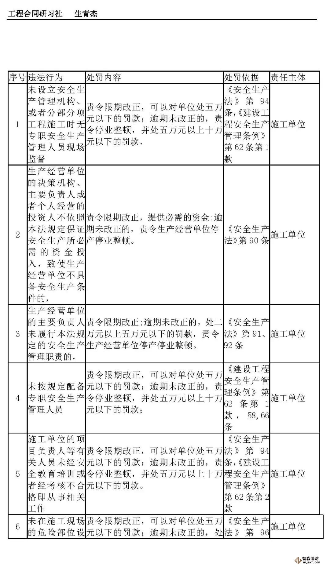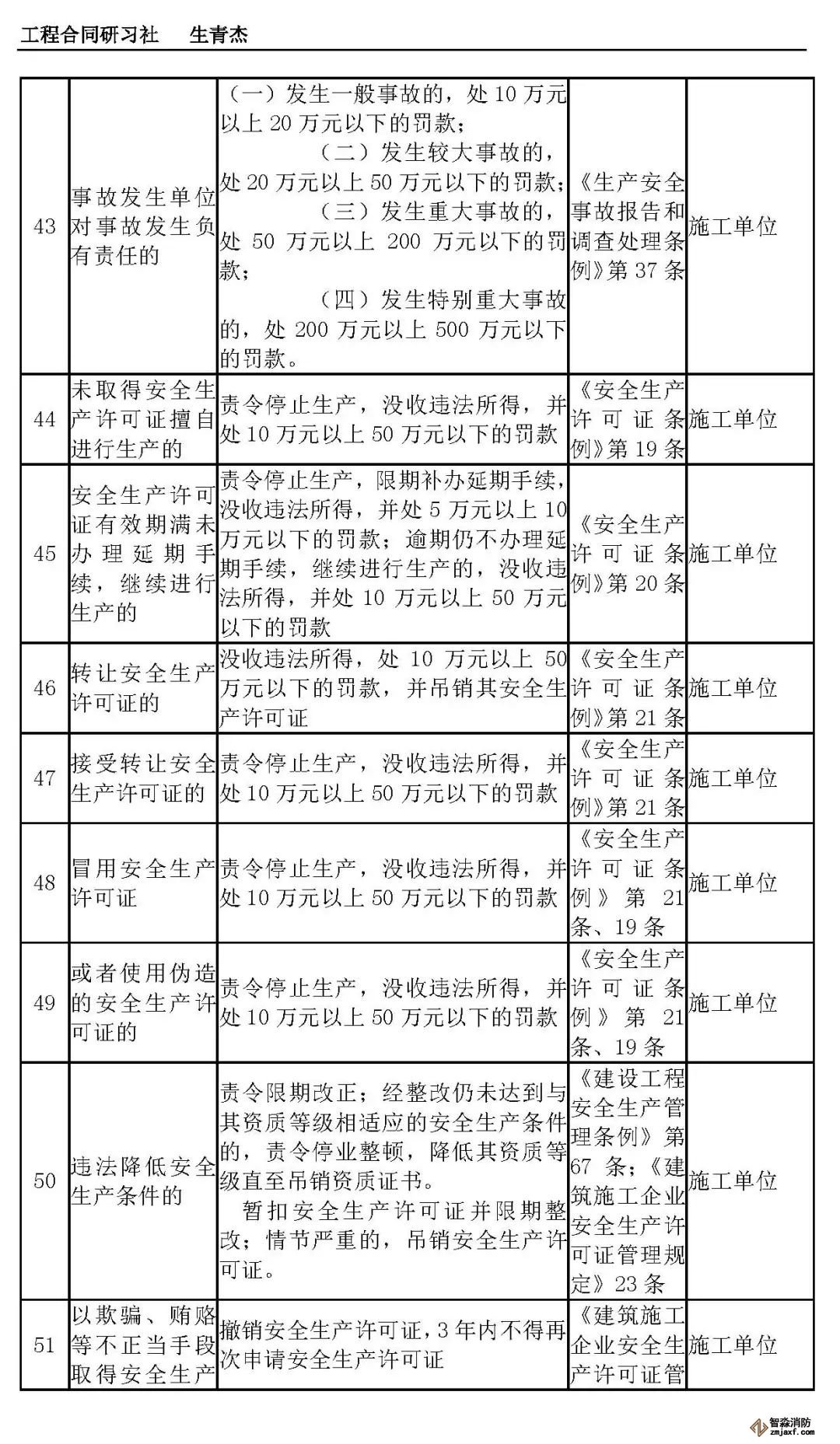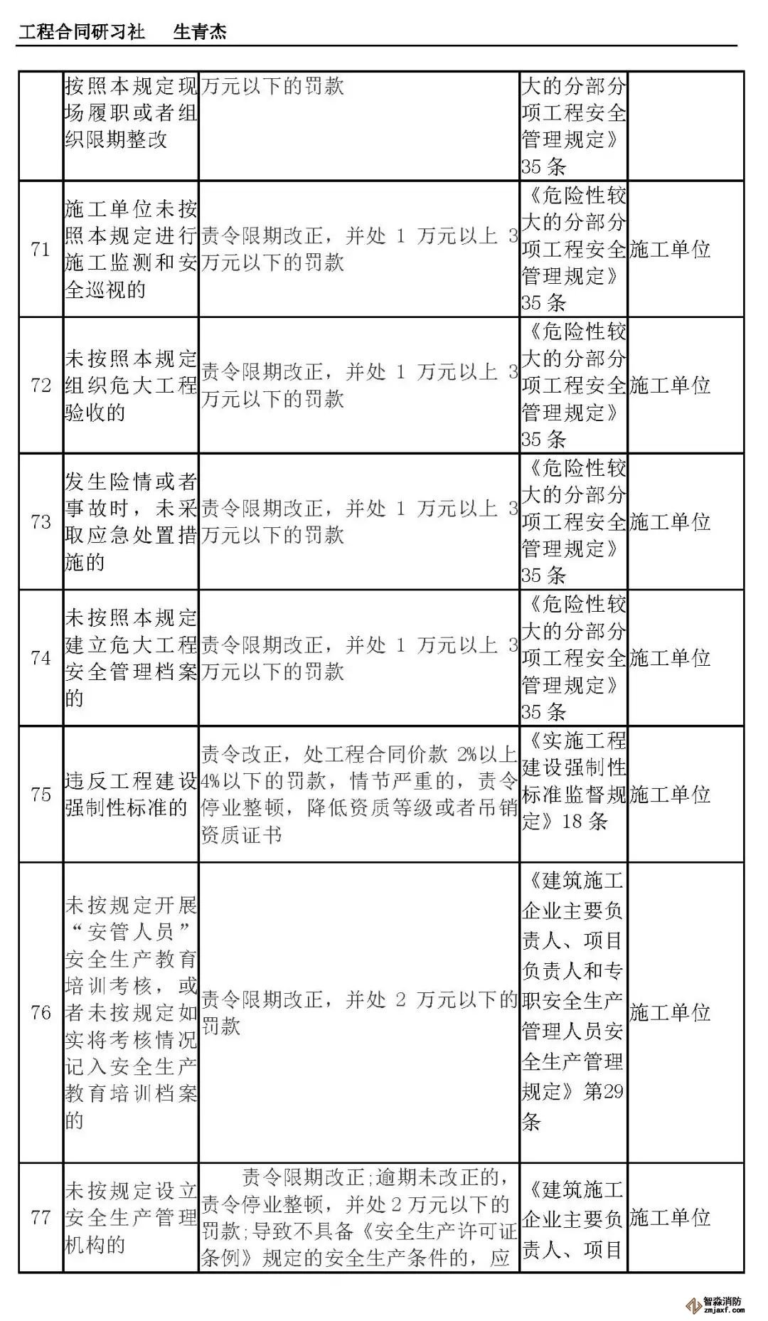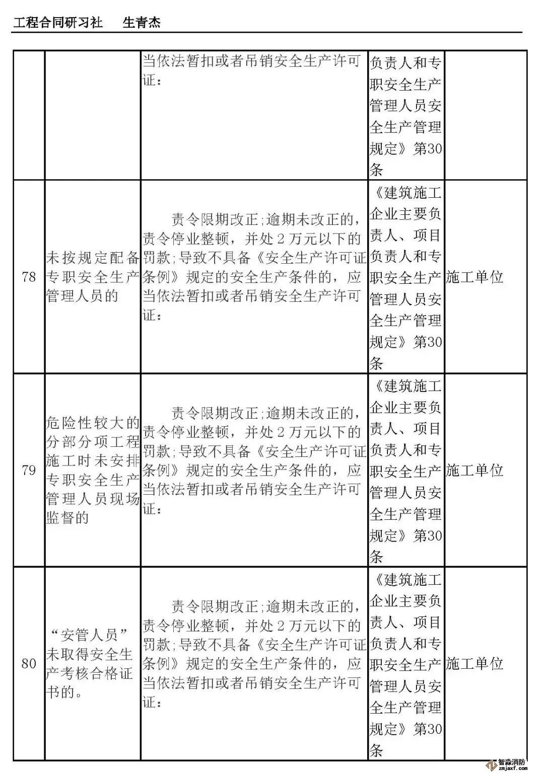 本文附表是施工单位的安全生产行政责任清单,共梳理出80种行政责任,其中不包括地方性法规和地方政府规章。施工单位可将此表中的风险点进行分解,并落实到人,建立明晰严格的安全责任体系。希望此表能对施工企业加强安全管理有一定作用。