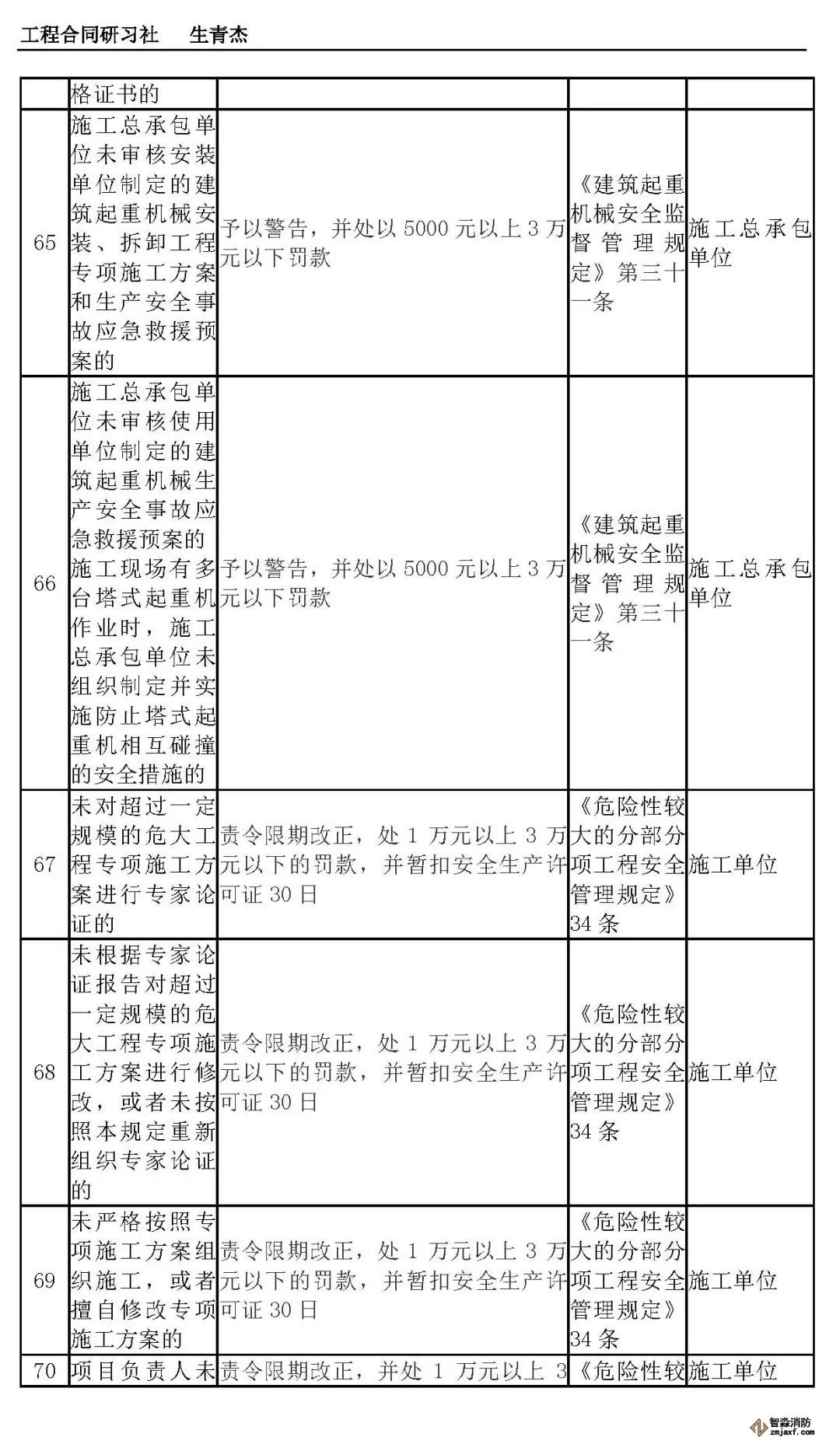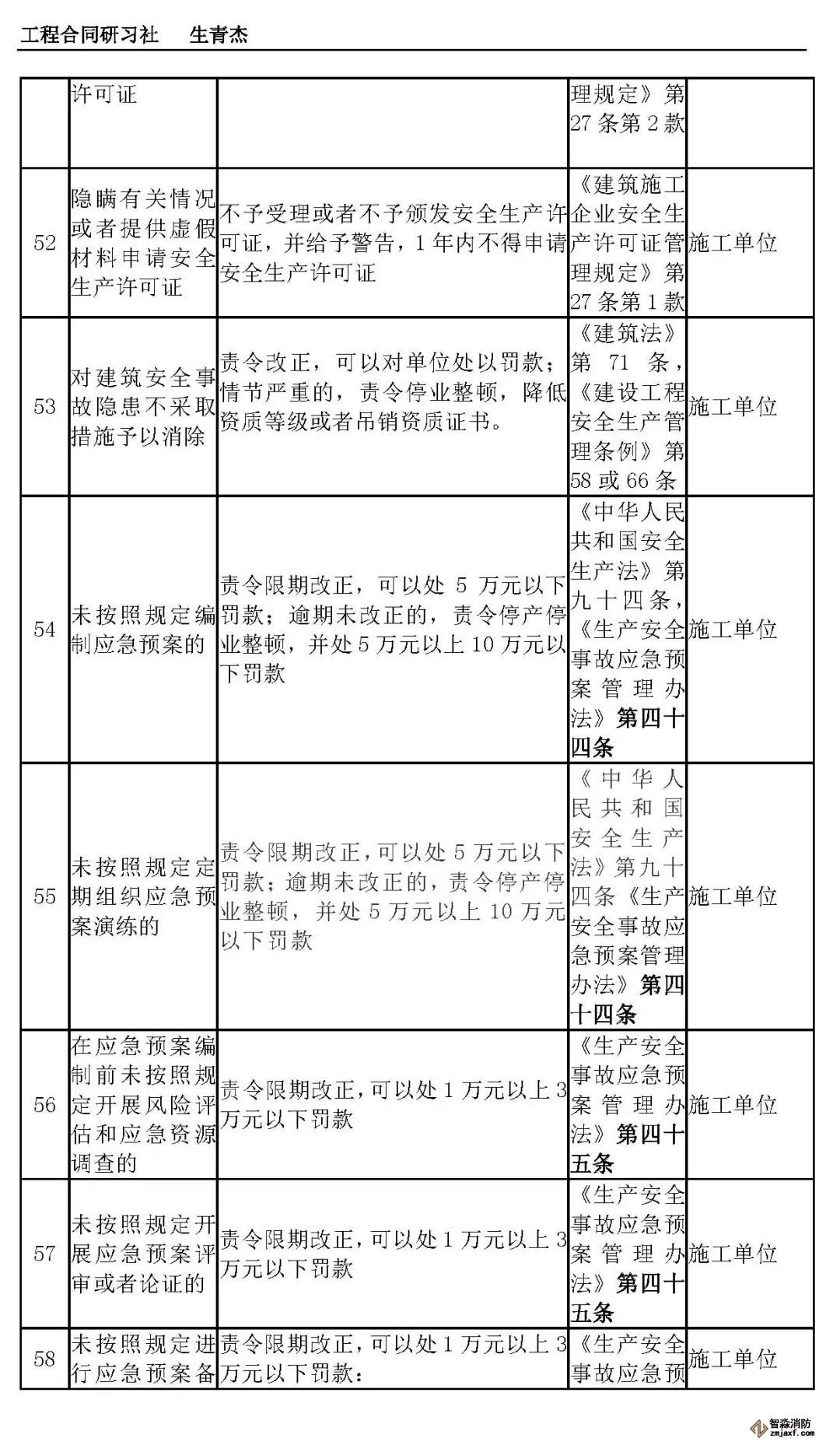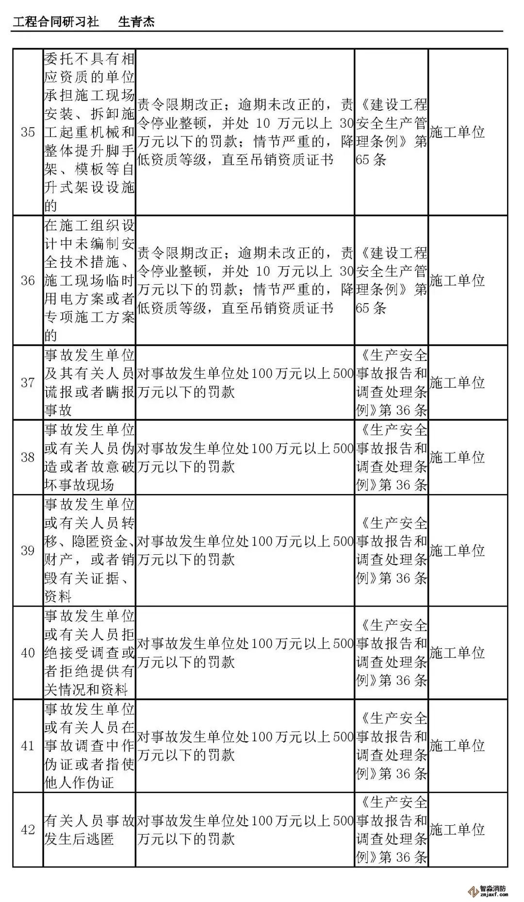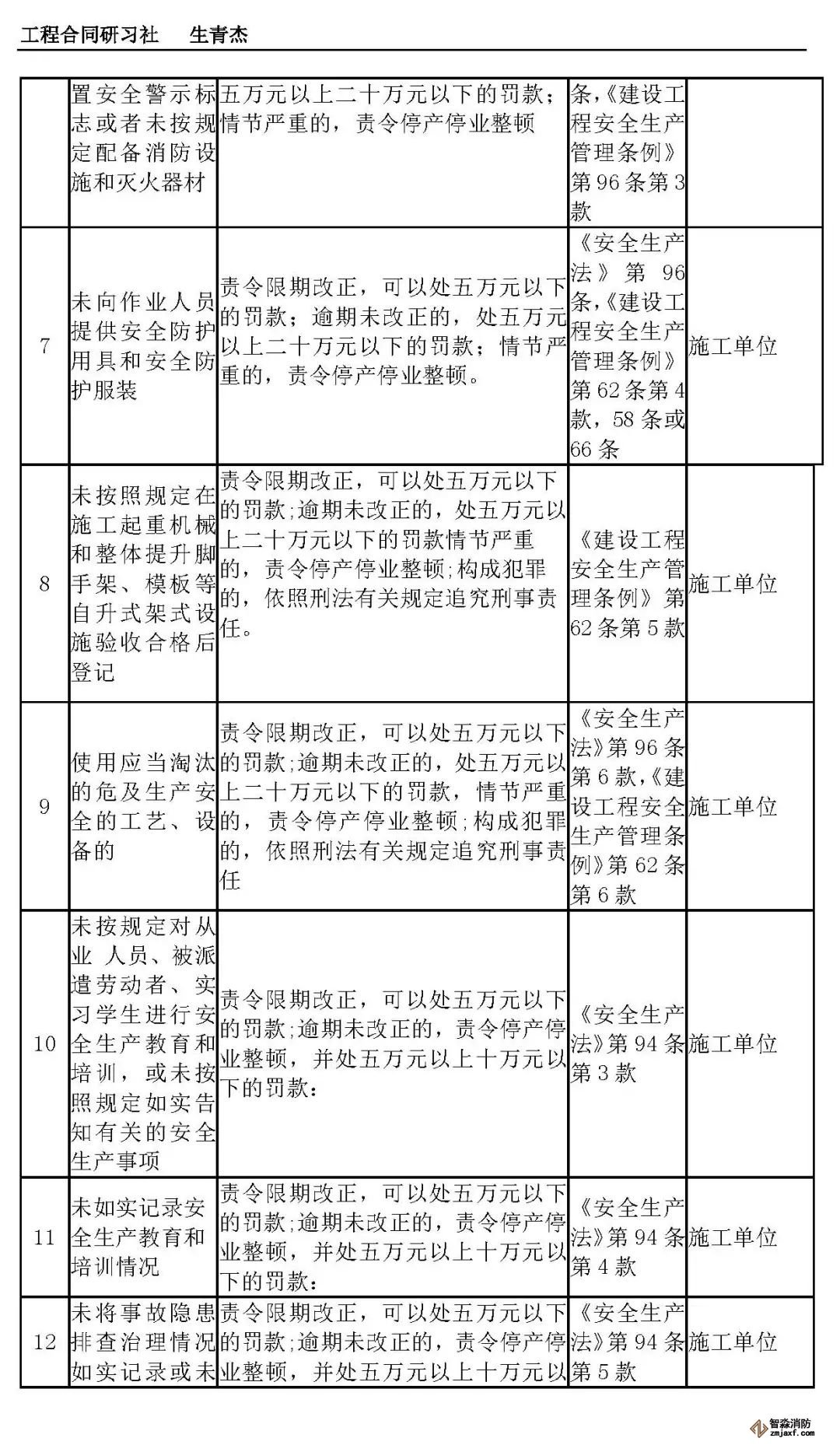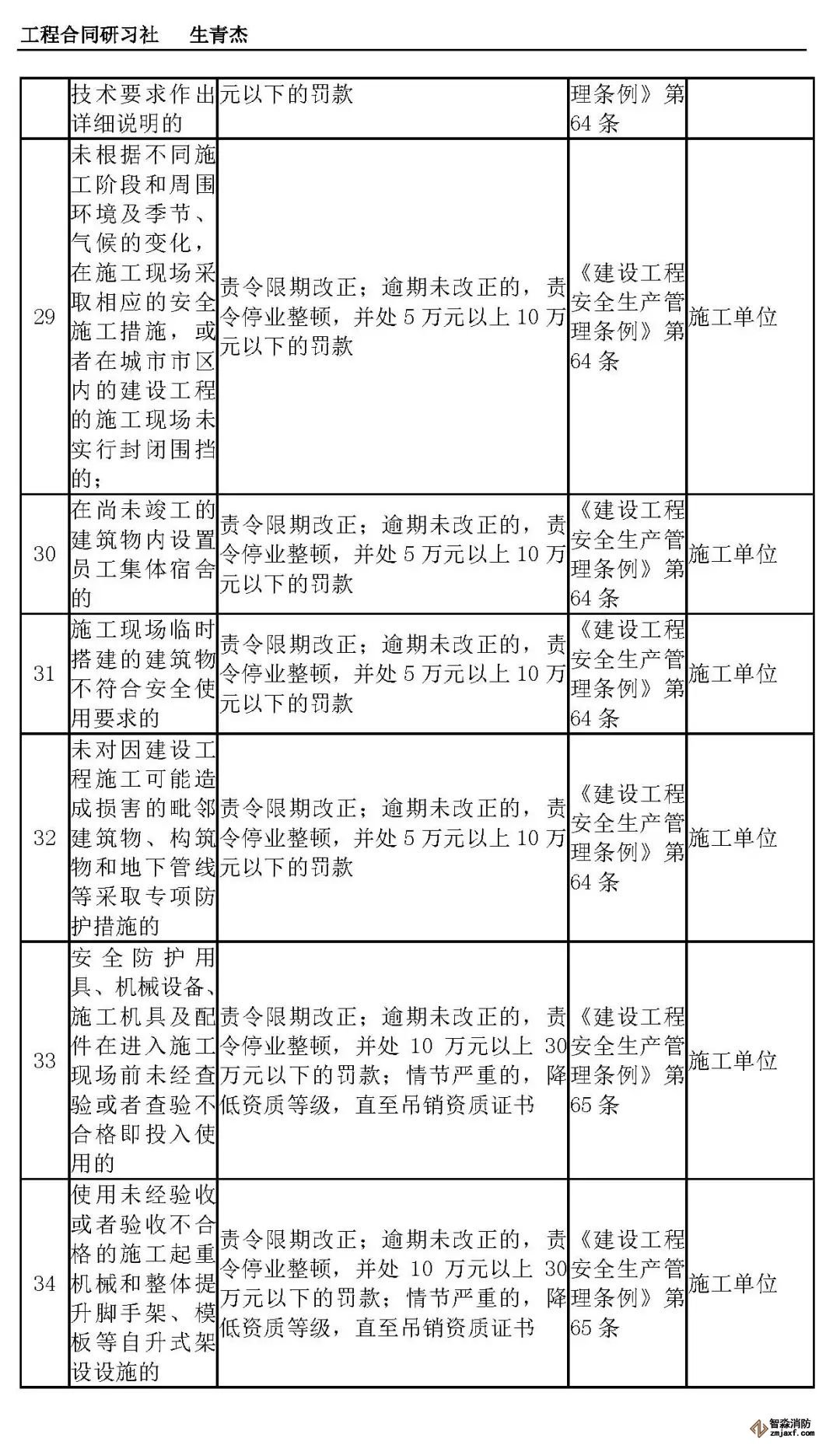 本文附表是施工单位的安全生产行政责任清单,共梳理出80种行政责任,其中不包括地方性法规和地方政府规章。施工单位可将此表中的风险点进行分解,并落实到人,建立明晰严格的安全责任体系。希望此表能对施工企业加强安全管理有一定作用。