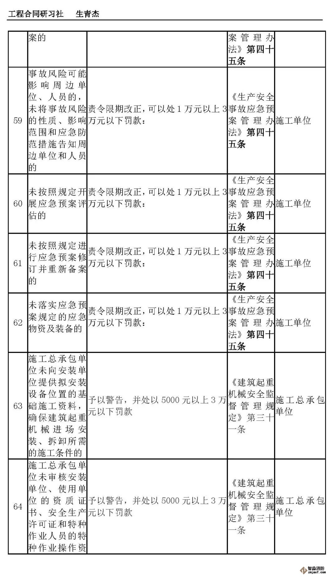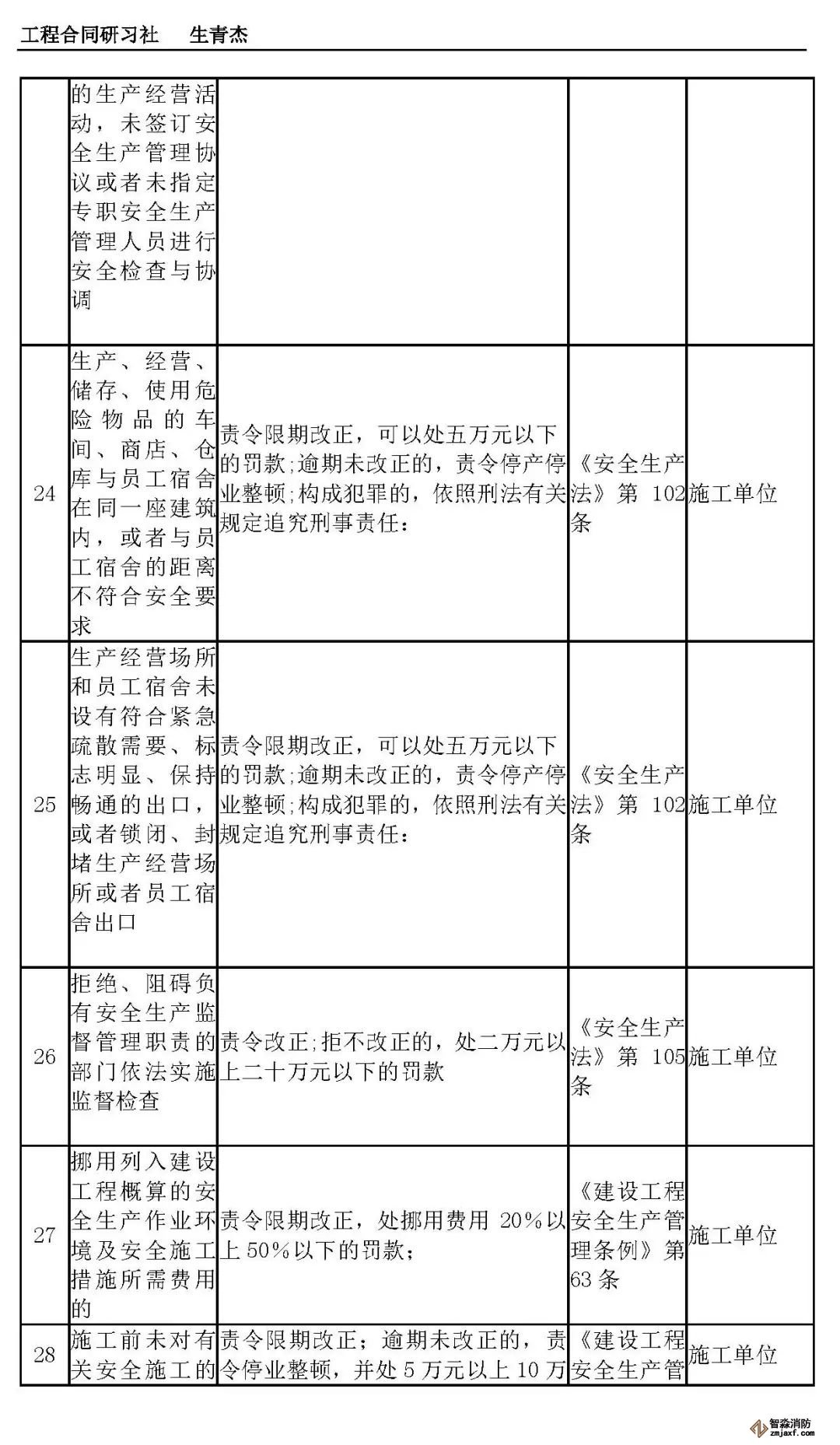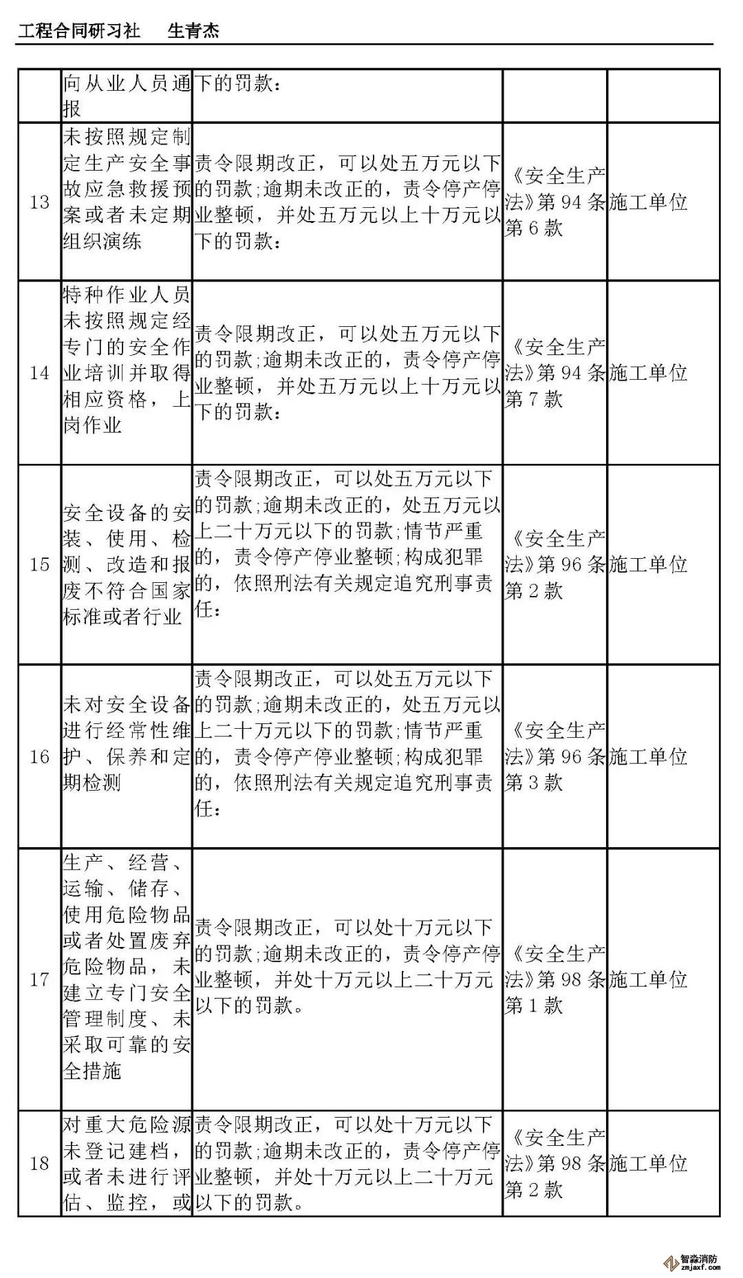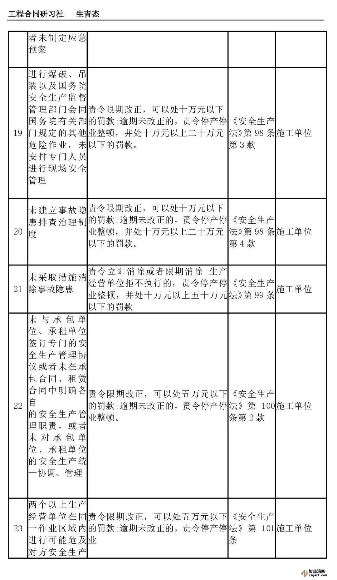 本文附表是施工单位的安全生产行政责任清单,共梳理出80种行政责任,其中不包括地方性法规和地方政府规章。施工单位可将此表中的风险点进行分解,并落实到人,建立明晰严格的安全责任体系。希望此表能对施工企业加强安全管理有一定作用。