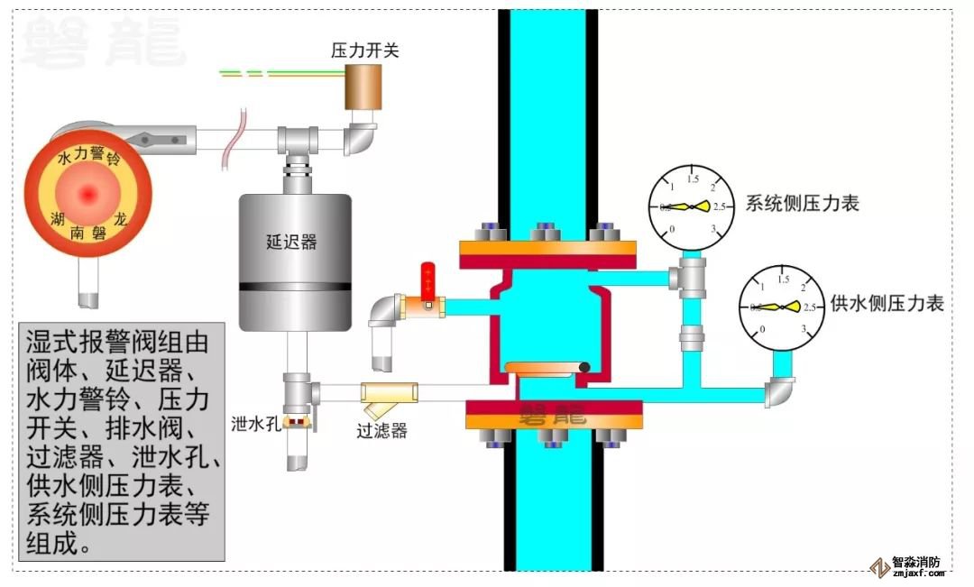 1、湿式报警阀组由阀体、延迟器、水力警铃、压力开关、排水阀、过滤器、泄水孔、供水侧压力表、系统侧压力表等组成。阀体被座圈和阀瓣分成上、下两腔,上腔(系统侧)与系统管网相通,下腔(供水侧)与水源相通。座圈上有多个沟槽小孔,沟槽小孔与报警水道相通。准工作状态时,沟槽小孔被阀瓣封闭,水流不能进入报警水道。阀体上设有补偿器(类似小孔单向阀),当系统侧管网有微小渗漏或水源压力有波动时,可以通过补偿器平衡阀体的上下腔压力,避免误报警。