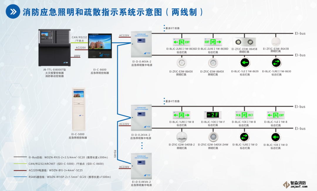 四线制系统和两线制系统应急照明控制器和应急照明集中电源的通讯干线 (RS485 通讯线),走弱电井(弱电架桥),采用 NH-RVSP-2*1.5mm 屏蔽双绞线。