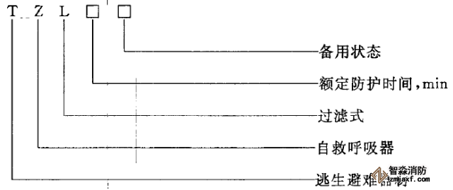 2. 过滤式自救呼吸器的型号编制规则如下图所示,其中“备用状态”有“存放型”和“携带型”两种,携带型用字母D表示,存放型省略表示。