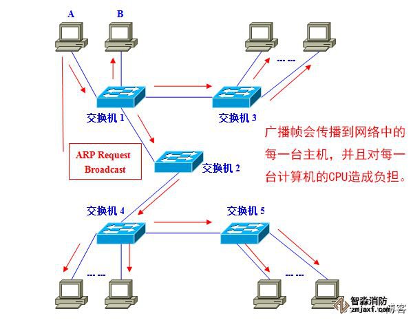 请大家注意一下,这个ARP请求原本是为了获得计算机B的MAC地址而发出的。也就是说:只要计算机B能收到就万事大吉了。可是事实上,数据帧却传遍整个网络,导致所有的计算机都收到了它。如此一来,一方面广播信息消耗了网络整体的带宽,另一方面,收到广播信息的计算机还要消耗一部分CPU时间来对它进行处理。造成了网络带宽和CPU运算能力的大量无谓消耗。