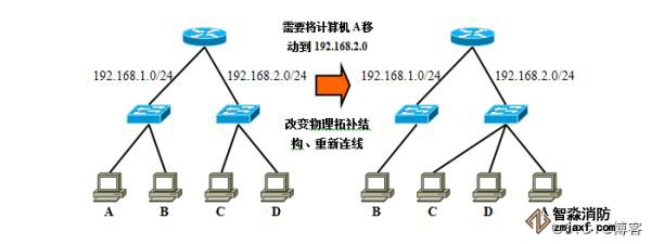 现在如果想将192.168.1.0/24这个网络上的计算机A转移到192.168.2.0/24上去,就需要改变物理连接、将A接到右侧的交换机上。