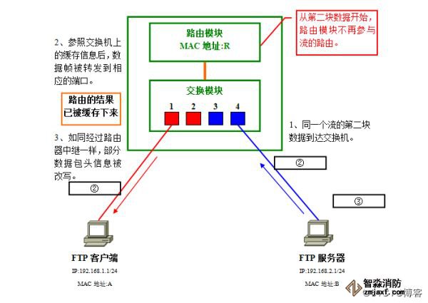 首先,整个流的第一块数据,照常由交换机转发→路由器路由→再次由交换机转发到目标所连端口。这时,将第一块数据路由的结果记录到缓存里保存下来。需要记录的信息有: