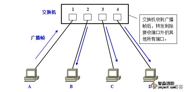 首先,在一台未设置任何VLAN的二层交换机上,任何广播帧都会被转发给除接收端口外的所有其他端口(Flooding)。例如,计算机A发送广播信息后,会被转发给端口2、3、4。