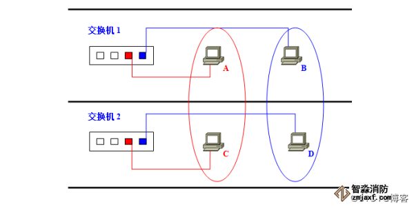 这时,如果在交换机上生成红、蓝两个VLAN;同时设置端口1、2属于红色VLAN、端口3、4属于蓝色VLAN。再从A发出广播帧的话,交换机就只会把它转发给同属于一个VLAN的其他端口——也就是同属于红色VLAN的端口2,不会再转发给属于蓝色VLAN的端口。