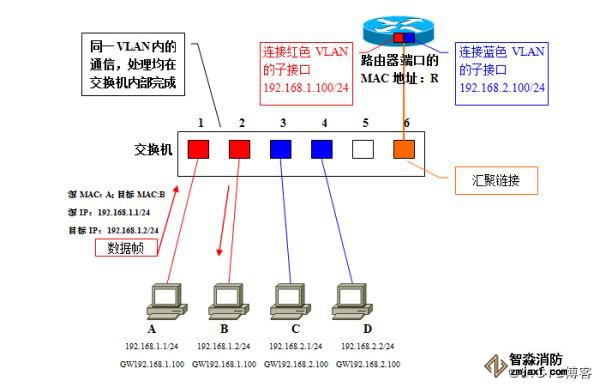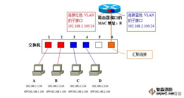 需要将连接在交换机1上192.168.1.0/24这个网段的计算机A转属192.168.2.0/24时,无需更改物理布线。只要在交换机上生成蓝色VLAN,然后将计算机A所连的端口1加入到蓝色VLAN中去,使它成为访问链接即可。