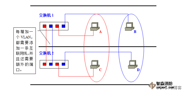 最简单的方法,自然是在交换机1和交换机2上各设一个红、蓝VLAN专用的接口并互联了。