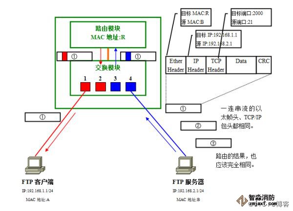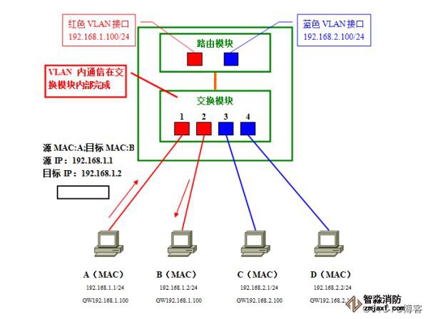 路由模块在收到数据帧时,先由数据帧附加的VLAN识别信息分辨出它属于红色VLAN,据此判断由红色VLAN接口负责接收并进行路由处理。因为目标网络192.168.2.0/24是直连路由器的网络、且对应蓝色VLAN;