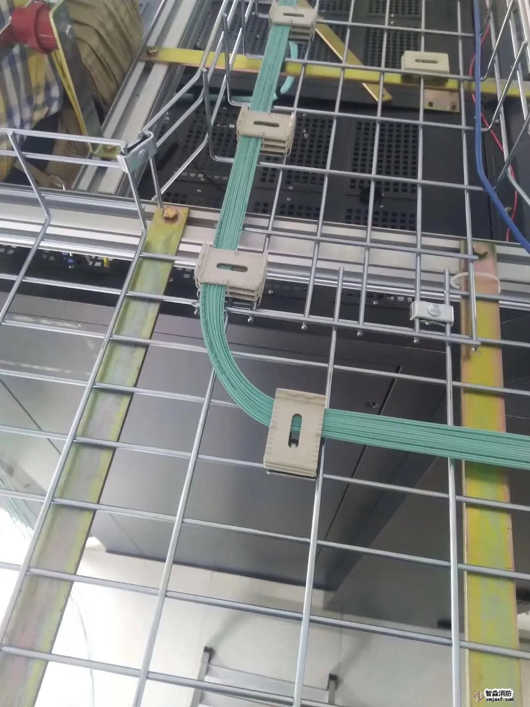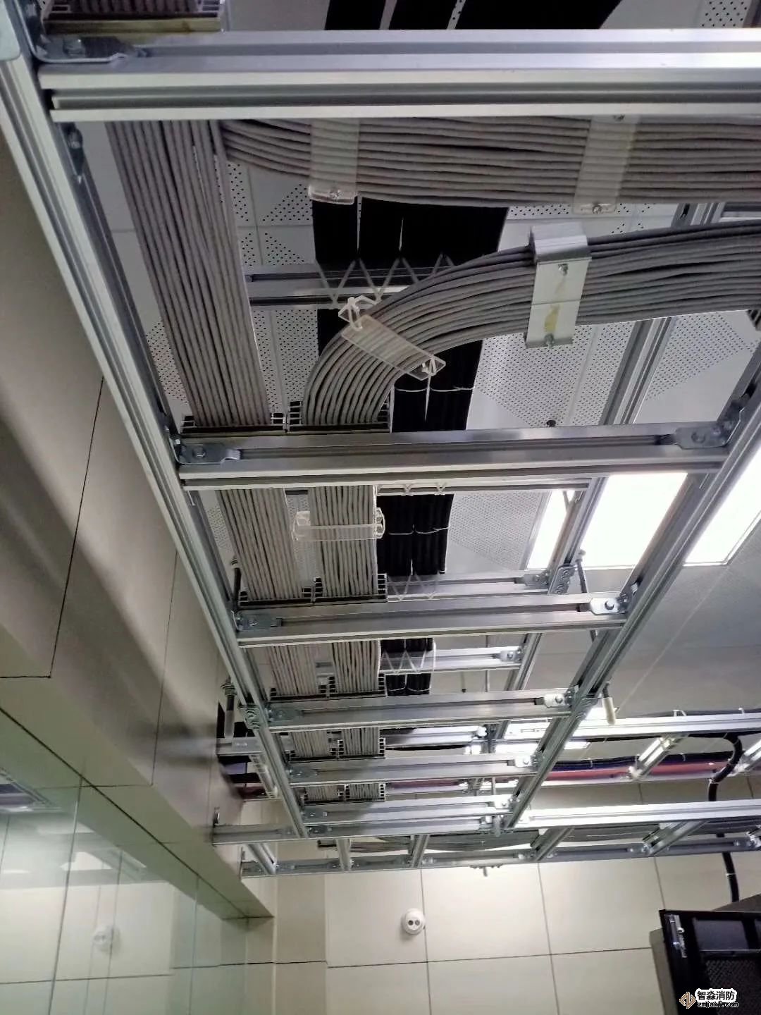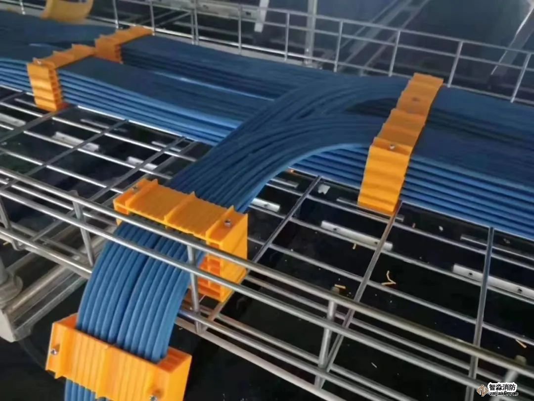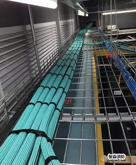 如图所示,桥架内光纤和网线分开整齐布放,每隔一段距离用扎带捆绑,保持美观。