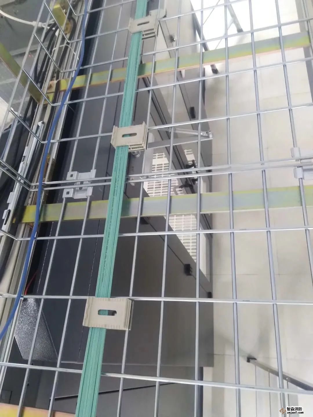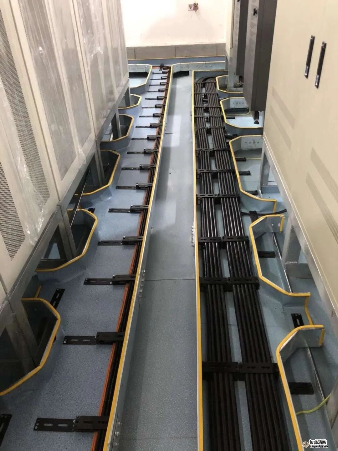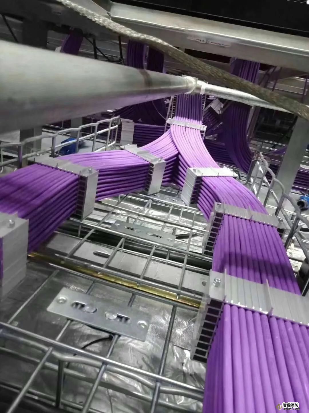 如图所示,桥架内光纤和网线分开整齐布放,每隔一段距离用扎带捆绑,保持美观。
