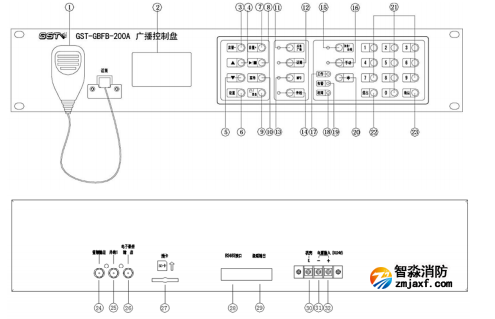 产品简介:一、海湾GST-GBFB-200广播分配盘概述GST-GBFB-200型广播分配盘是消防应急广播系统配套产品,它与音源设备、广播功率放大器、音箱、GST-LD-8305型输出模块等设备共同组成消防应急广播系统。同时GST-GBFB-200广播分配盘也通过RS485串行总线与消防控制器相连接,一起完成消防联动控制。另外根据现场的需要,它可以外接