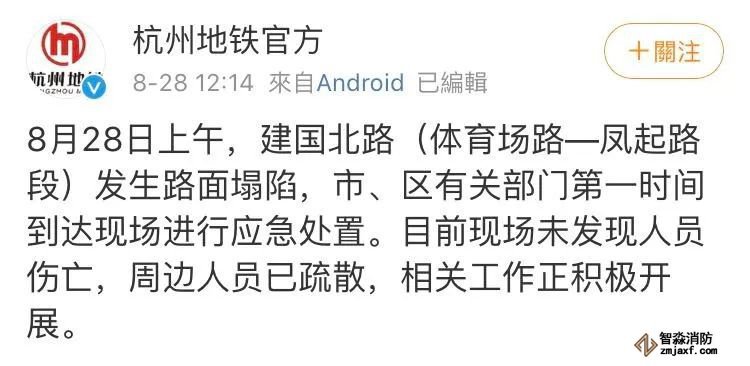 2019年8月28日中午11时许,杭州建国北路和体育场路交叉路口路面出现塌陷事故。初步查明,系地铁5号线联络通道施工发生渗漏水,导致该路段路面坍塌,伴随部分燃气泄漏。