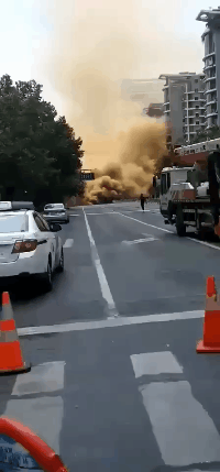 路面塌陷后,冒出黄色浓烟。随后杭州地铁官方微博也发布消息,称目前现场未发现人员伤亡,周边人员已疏散,相关工作正积极展开。