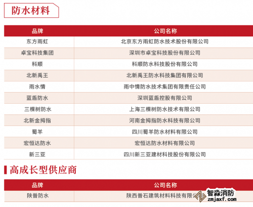 整体的趋势是,房企对于防水这类隐蔽工程的质量控制愈发严格,由于无法分辨质量、试错成本过高,所以近年来房企选择品牌实力强的大防水企业趋势明显。如东方雨虹、卓宝科技集团、科顺凭品牌影响力、质量、资金实力等持续获得开发商青睐,品牌优势明显。另外,北新禹王、雨水情、蓝盾防水等深耕区域的房企也获得开发商认可。