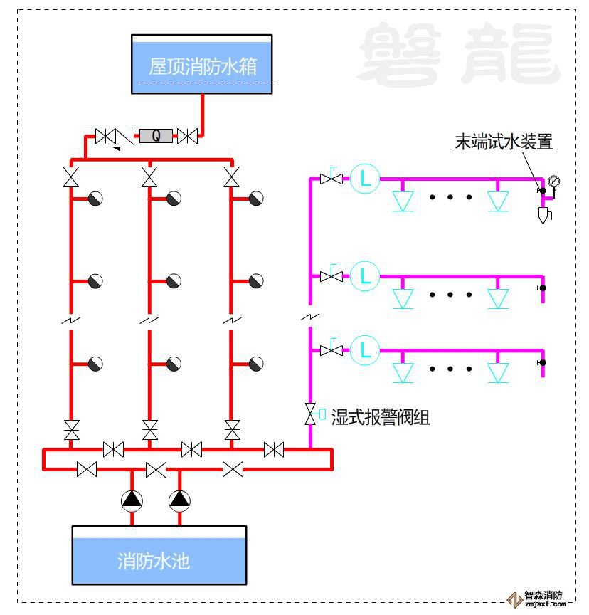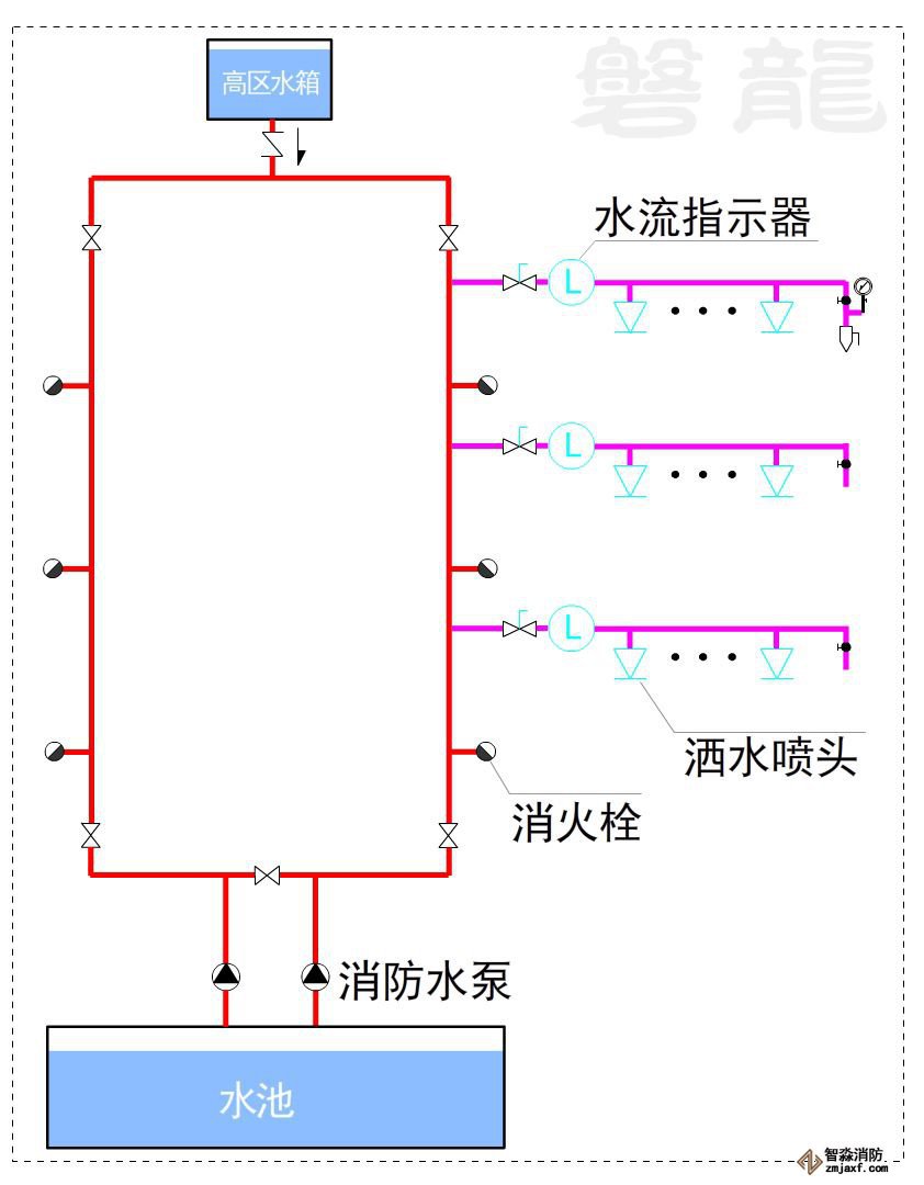 消防立管可以是消火栓管网或自动喷水灭火系统管网。每户引入管应设置水流指示器(或流量开关),可以指示报警住户位置,也可以防止消防水滥用。