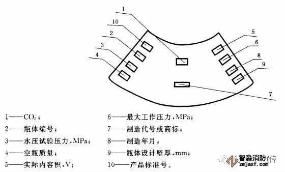 二氧化碳灭火器应在瓶体肩部打钢印。钢印应清晰、排列整齐。钢印的字体高度为4 mm~10 mm;深度为0.3 mm~0.5 mm;钢印的字体排列可呈扇面状排列如图3,也可在瓶肩部沿圆周线排列,各项目的排列应按图3中指引号为序。钢印标记应有下列内容: