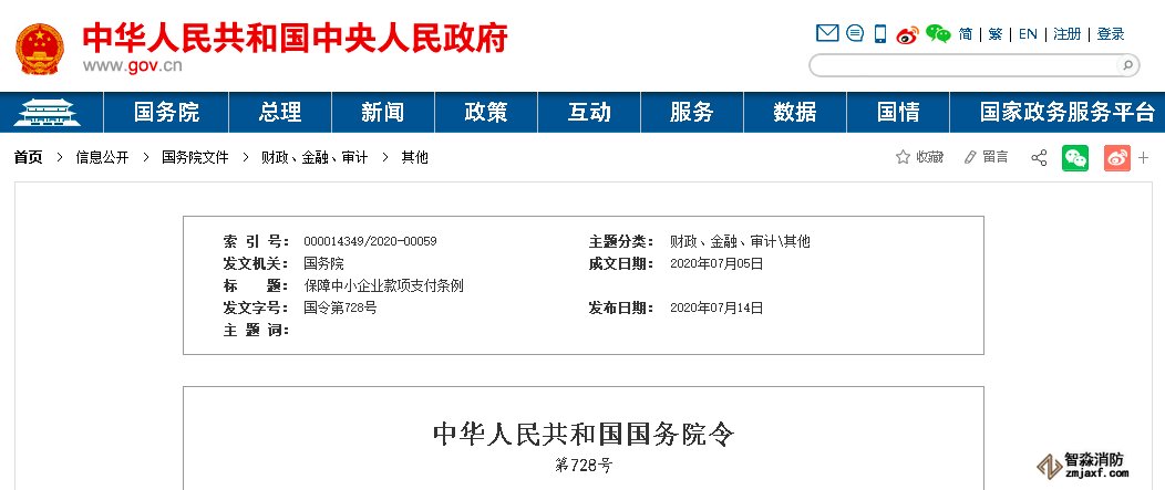《保障中小企业款项支付条例》(中华人民共和国国务院令第728号)正式发布,自2020年9月1日起施行。
