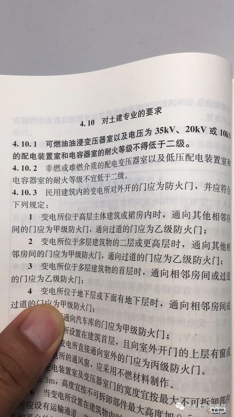解析:与老《民规》4.9.1稍微有区别。旧规:4.9.1 可燃油油浸电力变压器室的耐火等级应为一级。非燃或难燃介质的电力变压器室、电压为10(6)kV的配电装置室和电容器室的耐火等级不应低于二级。低压配电装置室和电容器室的耐火等级不应低于三级。