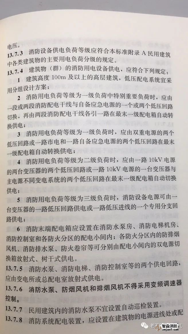 解析:此处强条13.7.6与旧《民规》13.9.6后半句一致:消防设备的控制回路不得采用变频调速器作为控制装置。并升级为强条。