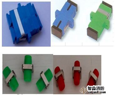 上图是各种光连接器与之对应的适配器,也称法兰盘,用在ODF架上,供光纤连接。