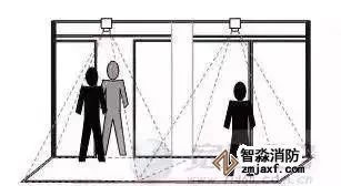 商场、超市中用于客流统计的摄像机应安装于各区域的进出口大门、楼梯口、通道等场所,用于准确获取各出入口的实时视频信息,如上图所示。