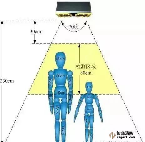 人的身高以平均1.7m计算,摄像机安装高度建议3m-3.5m,距离出入口水平距离1.5m-3m,距离客流方向0.5m-1m,俯视角度不小于70度。
