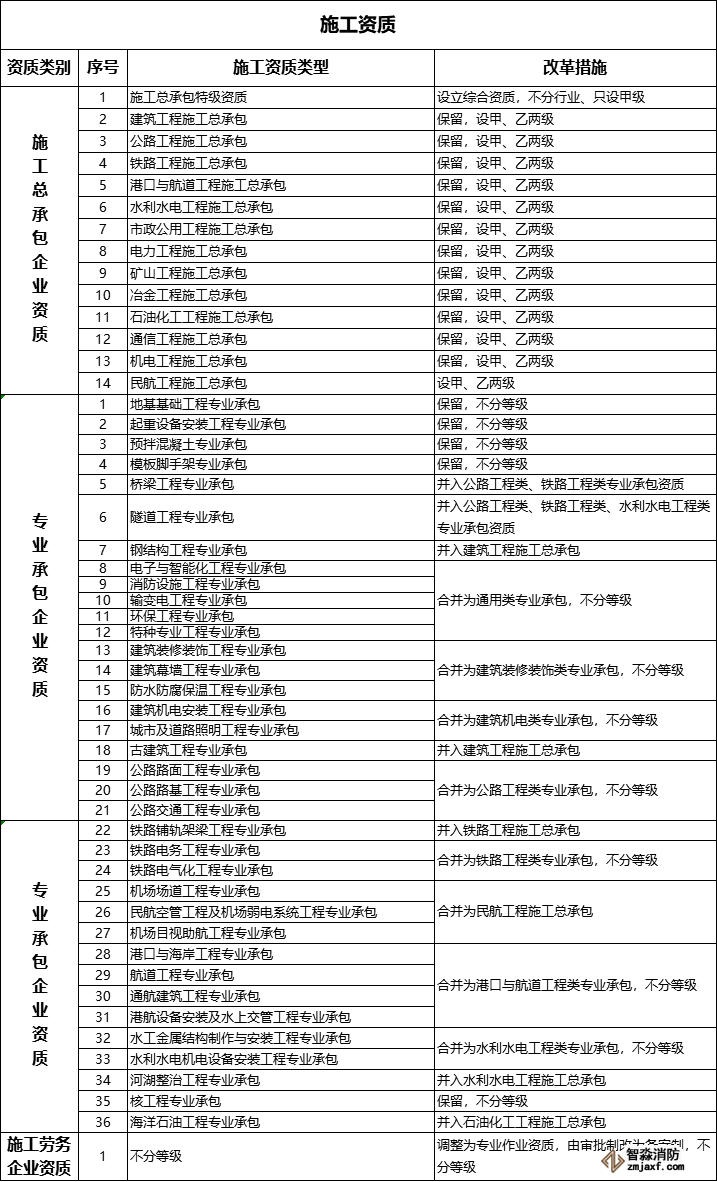 2014年11月,住建部将专业承包资质由60个压缩至36个。