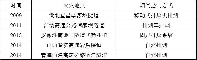 表1.列出了2009-2014年以来国内发生的几起隧道火灾及其火灾场地排烟方法。