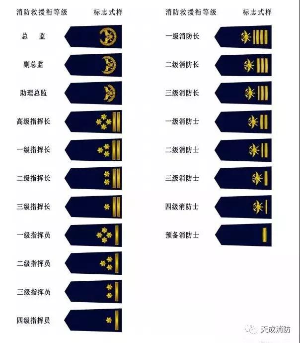高级消防员衔标志缀钉一枚徽标,一级消防长衔标志缀钉三粗一细四道横杠,二级消防长衔标志缀钉三道粗横杠,三级消防长衔标志缀钉二粗一细三道横杠。