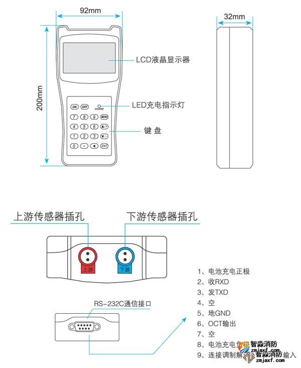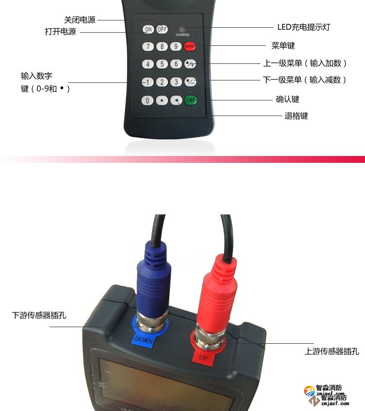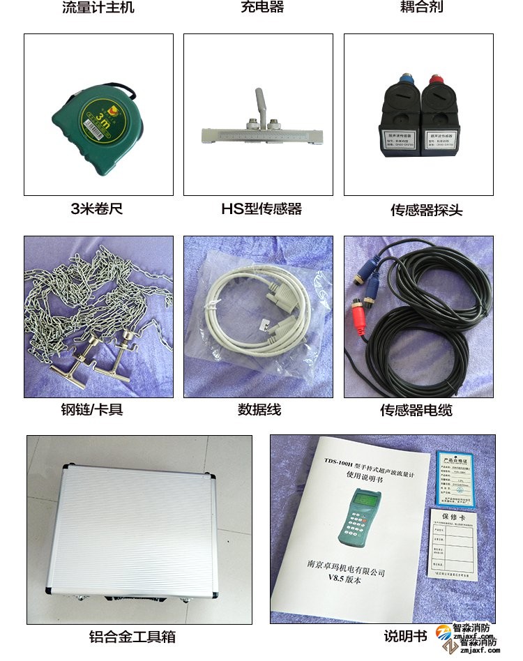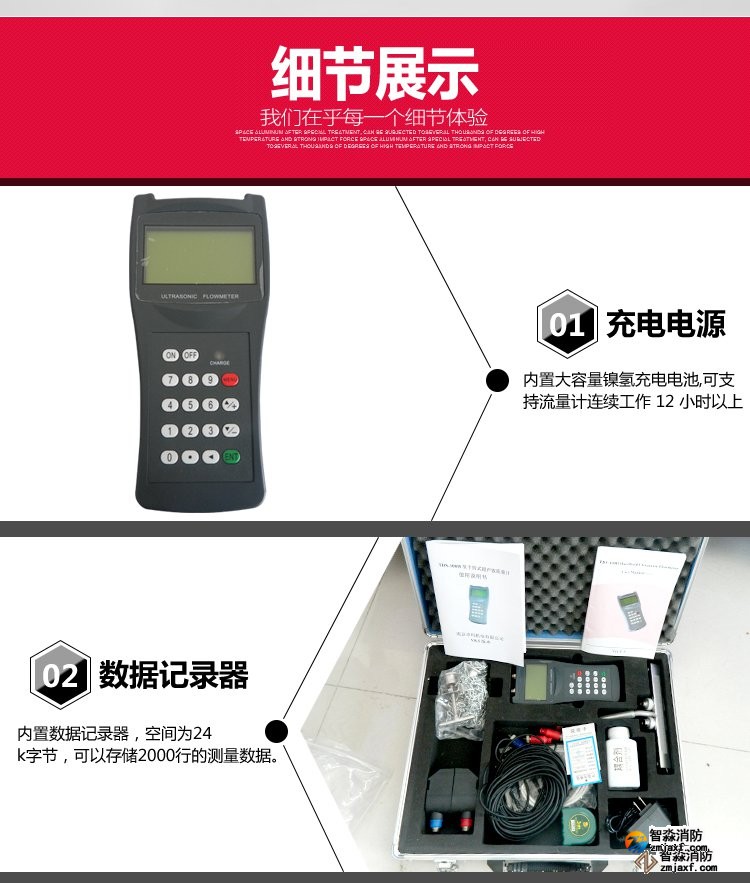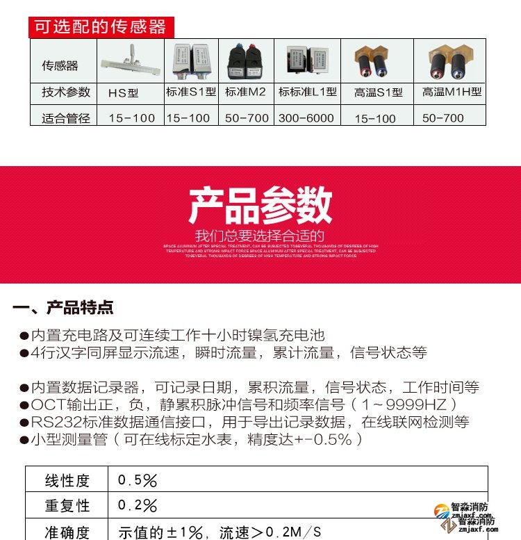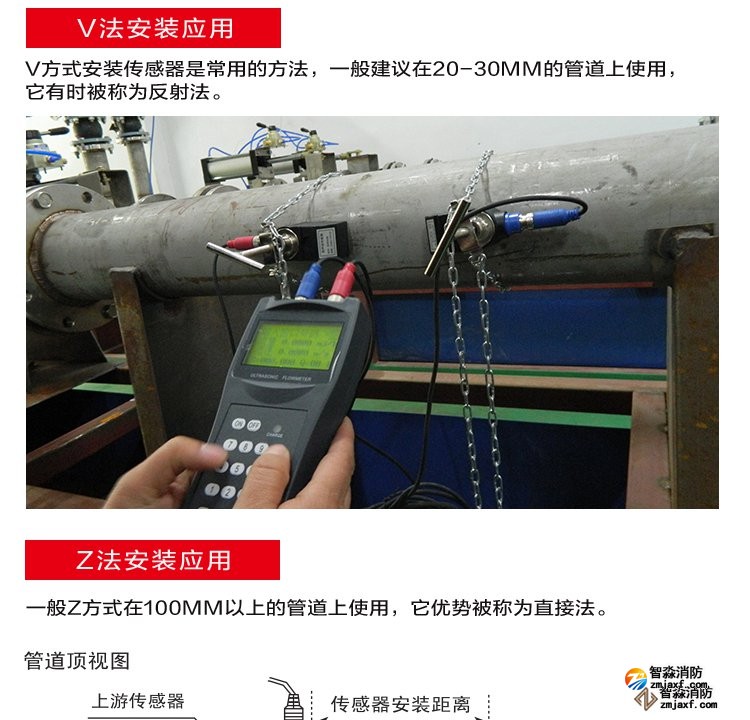 超声波流量计测量管径范围:0mm~300mm;WWW.XFJCYQ.COM精度:±1%用于检测消火栓系统和水喷淋系统的给水量以及消防竖管的流量分配。