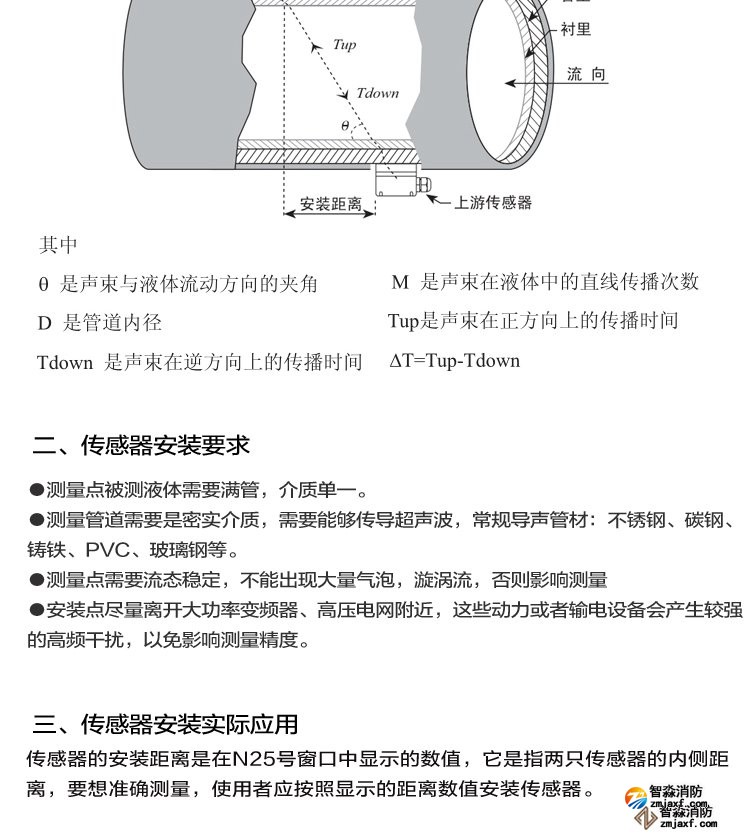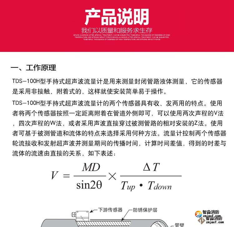 产品简介:超声波流量计测量管径范围:0mm~300mm;WWW.XFJCYQ.COM精度:±1%用于检测消火栓系统和水喷淋系统的给水量以及消防竖管的流量分配。超声波在流动的流体中传播时就载上流体流速的信息。因此通过接收到的超声波就可以检测出流体的流速,从而换算成流量,图1。图1 超声波流量计(一)、