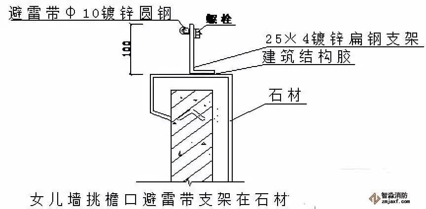 ⑷ 女儿墙挑檐用石材等装饰材料包住后,避雷带支架在石材上的固定做法如下图: