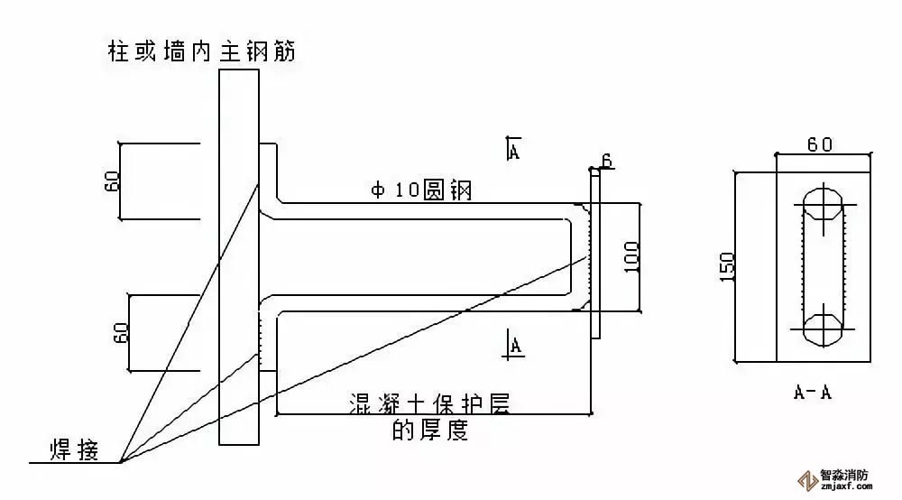 ⑶φ10的金属圆钢与钢筋或窗框等建筑物金属构件焊接长度不小于60mm。