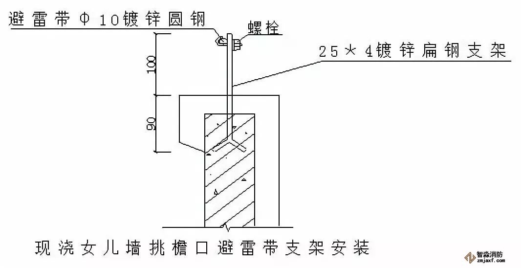 ⑴现浇女儿墙挑檐避雷带支架安装做法如下图,扁钢支架在安装时要密切和土建专业配合好,对成排的避雷带支架的水平度、垂直度要拉线逐个检查。
