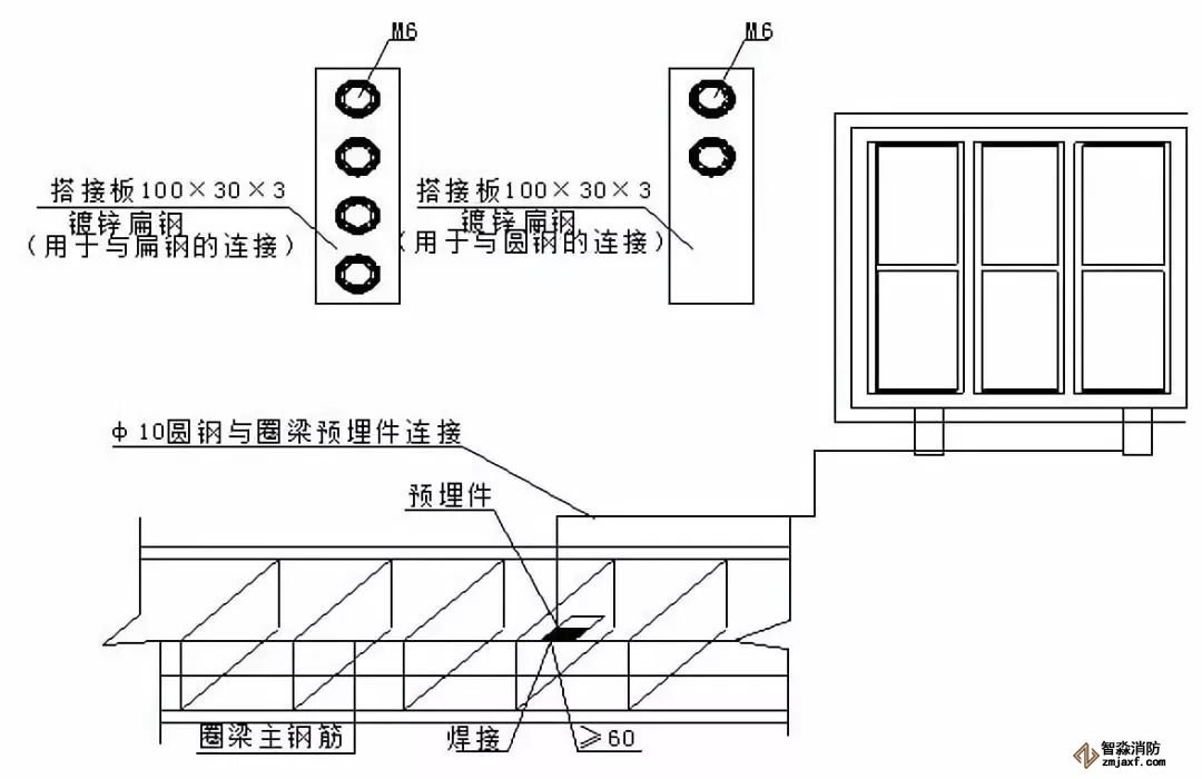 ⑸金属窗框的等电位也可从窗框的顶部或侧面与圈梁或柱主筋预埋件连接,连接件可以是25×4的镀锌扁钢或φ10的圆钢。