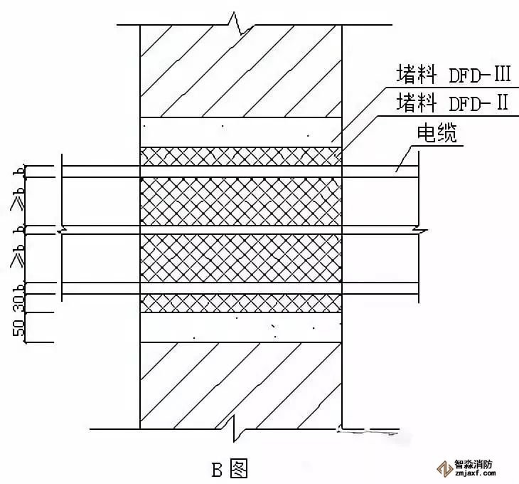 ⑵B图电缆穿过墙上的孔洞,间隙用堵料填塞。