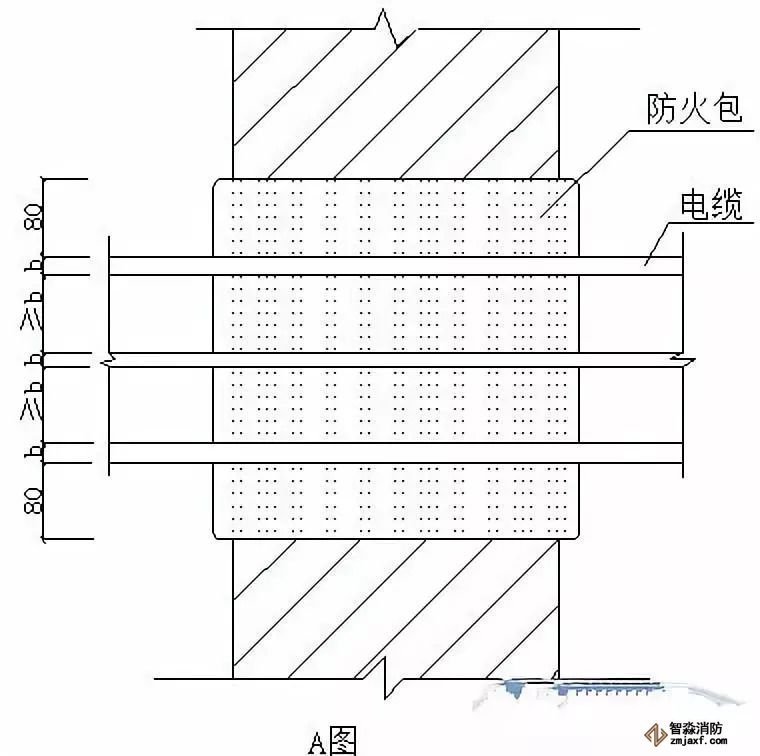 ⑴A图用防火包封堵墙上孔洞,电缆从防火包内穿过。